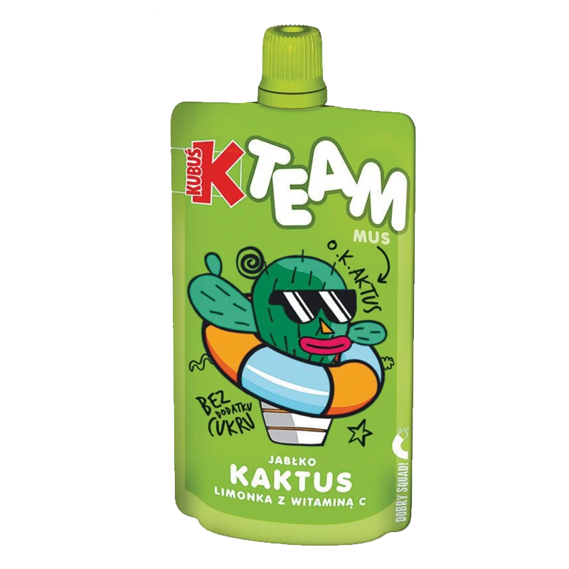 Seria musów owocowych Kubuś Team 100g, czyli trzy egzotyczne smaki w opakowaniu z wyjątkową grafiką Zarówno „dobry squad”, czyli kombinacja smaków, jak i grafika opakowania jednoznacznie wskazują grupę docelową określaną jako starsze dzieciaki, czyli te wieku ok 6-9 lat. produkt spełnia kryteria tzw. ustawy sklepikowej, czyli może być sprzedawany we wszystkich placówkach oświatowych.
