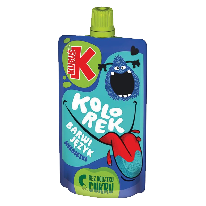 Seria musów owocowych Kubuś Kolorek 100g, czyli dwa smaki w opakowaniu z wyjątkową grafiką. Dodatkowo barwi język na kolory: czarny oraz niebieski. Produkt spełnia kryteria tzw. ustawy sklepikowej, czyli może być sprzedawany we wszystkich placówkach oświatowych.